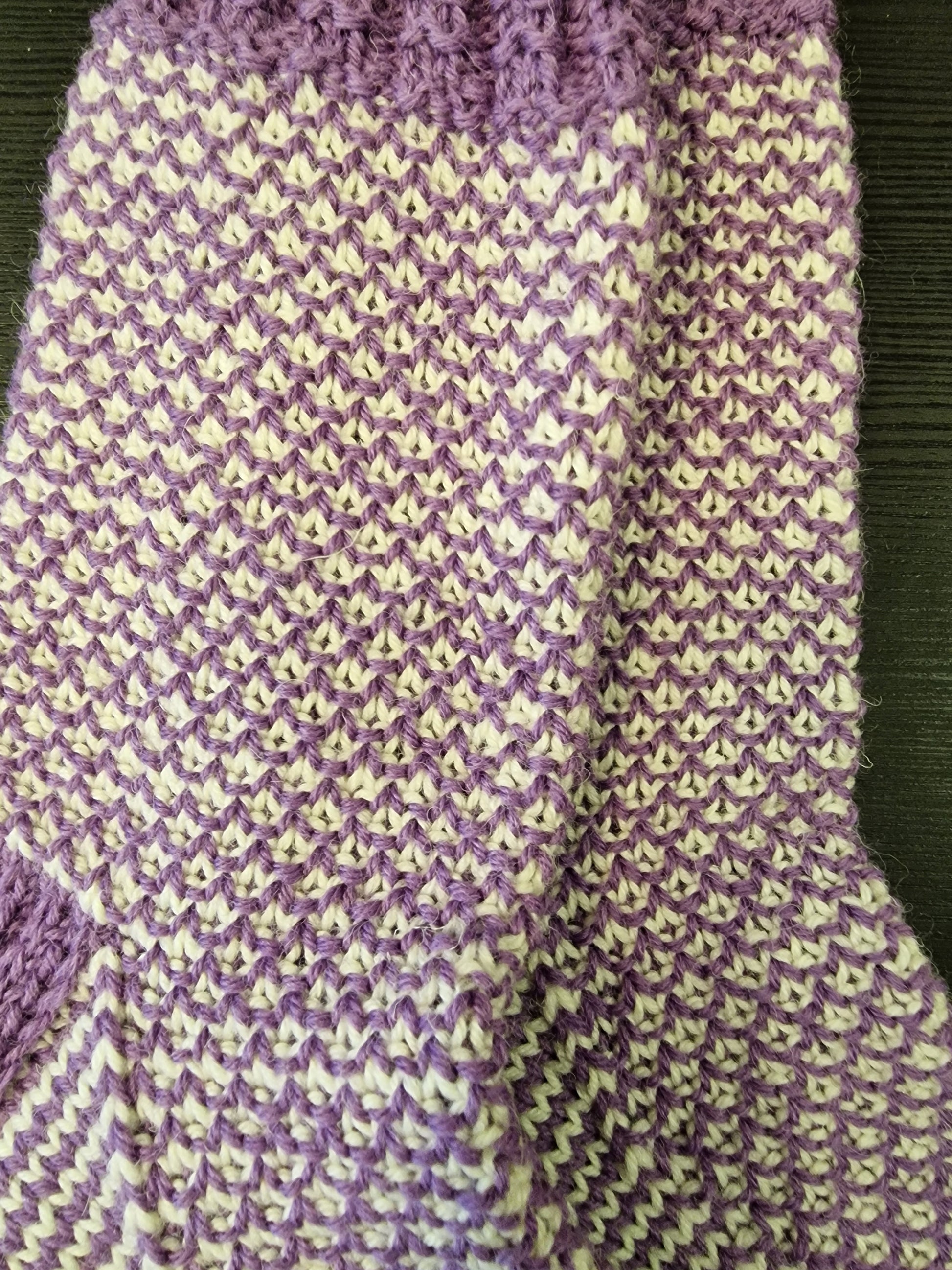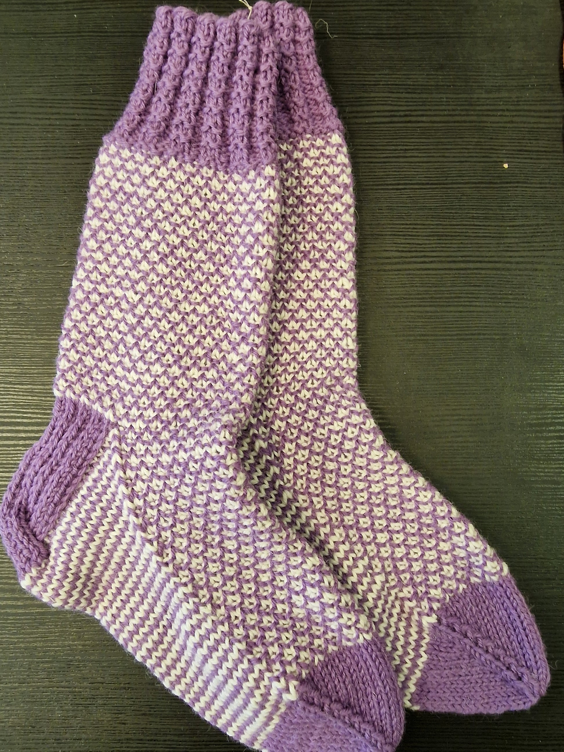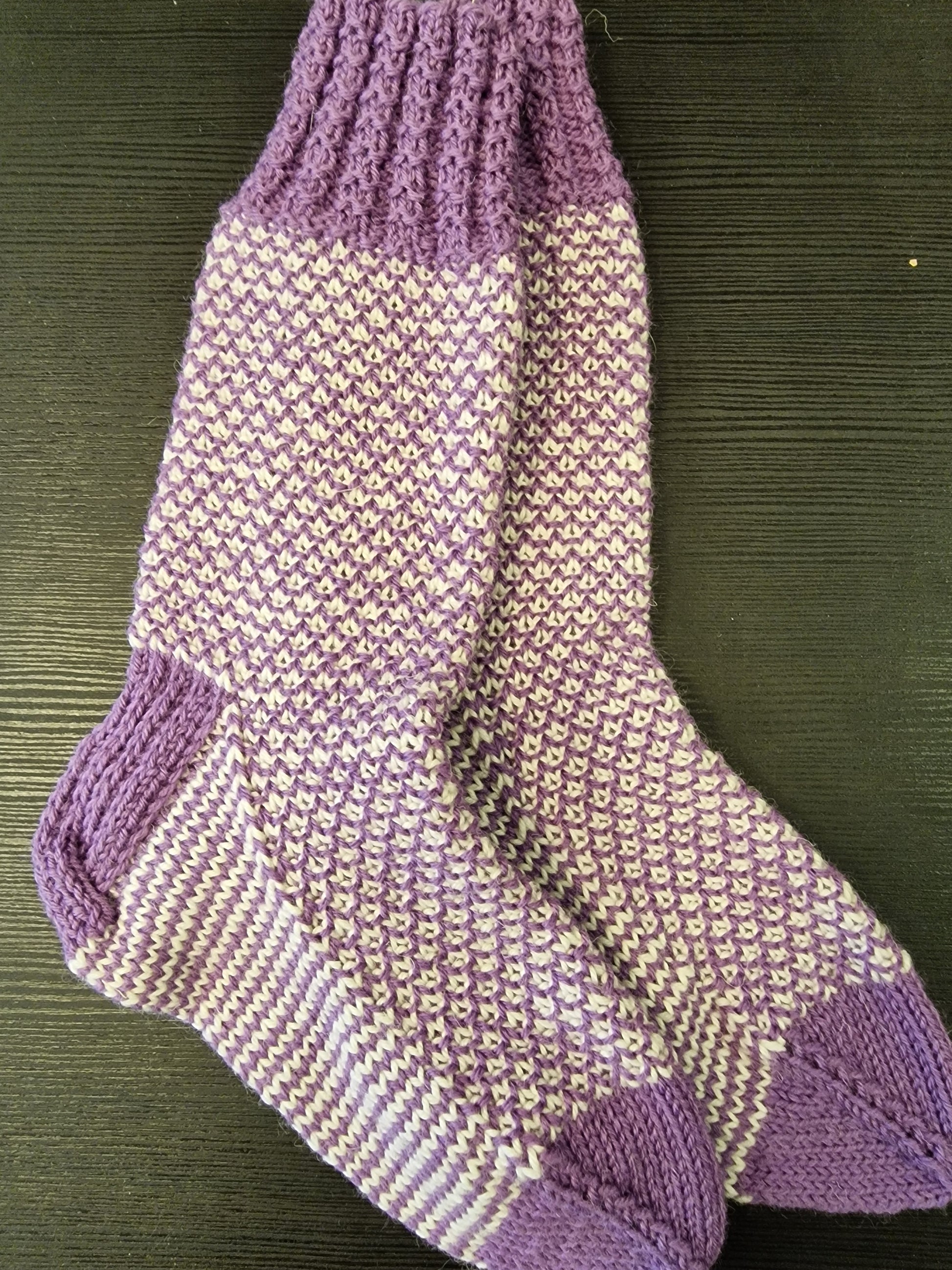 Lange sokker strikket i sportsragg. De er doble pga mønsteret. Størrelse 39/40.